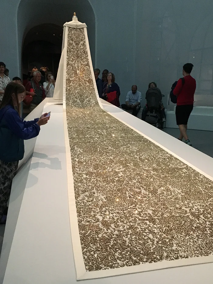 This dress's meters-long train sparkles like a gilded altarpiece.