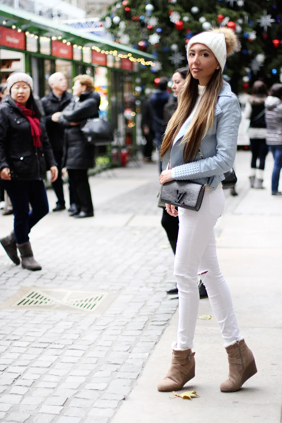 For this classic winter look I opted for a light pastel blue jacket from DressLilly (Click HERE for discount coupons), complementary super warm wool sweater I ave had for ages, white jeans and my new winter staple, a Pom Pom London hat with cute fur pompom.