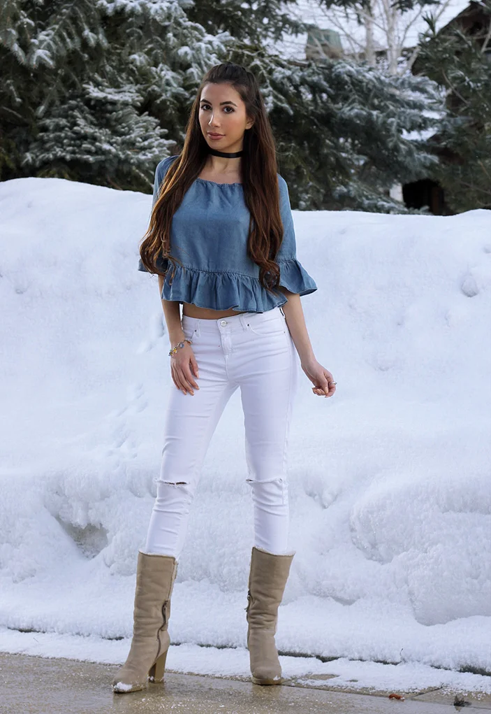 Imagining Marie and her ladies-in-waiting dressing up as peasants and singing songs in the field inspired me to create this casual look. It is adapted to our century, so don't be surprised seeing me in white jeans. I added little details evocative of Marie: a cute ribbon on my neck, baby blue 'peasant' style off-shoulder top and soft wavy hair.